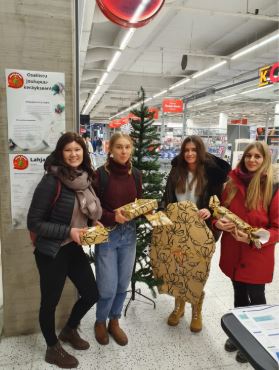 Merrily fitting the season of pre-Christmas, a time perfect for giving, they set out to bring joy to two opposite age groups – those with several Christmasses behind them, and those with many more Christmasses ahead. Together with their group, Katharina, Heini and Krista first visited the elderly care home Ruskakoti where they took part in a festive sing-along event. Carrying on from carrols, they then got involved with the Joulupuu (’Christmas tree’) charity collection project which aims to bring joy children of less-fortunate families.