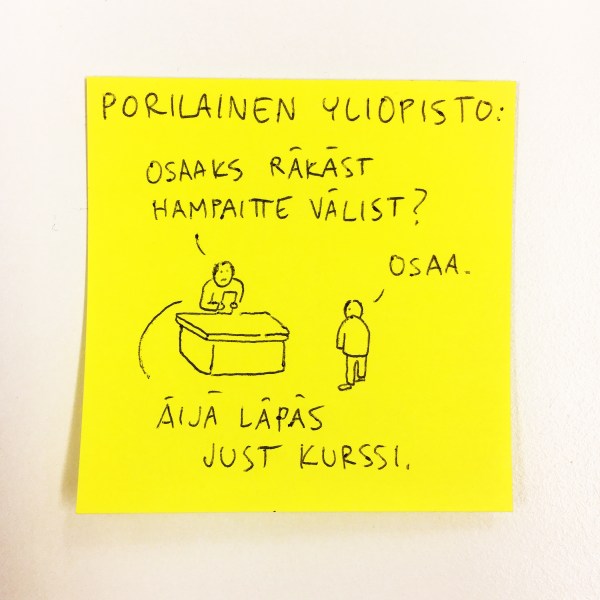 Pointti haastatteli supersuosittua Pierupersettä ja sai vinkkejä opiskeluun ja elämään noin yleensä. Lisäksi taiteilija loihti jutun päätteeksi ikioman sarjakuvaklipin meille porilaisille opiskelijoille. Mistä Pieruperse sai alkunsa? Eräänä sateisena päivänä sain näyn, jossa minua kehotettiin lataamaan sukupuolielimien kuvia internetiin. En kuitenkaan tohtinut ryhtyä kuvaushommiin, joten päätin tarttua tussiin. Mistä ideat kuviin syntyvät? Syntyprosessia voisi verrata ruoansulatukseen:... Continue Reading →